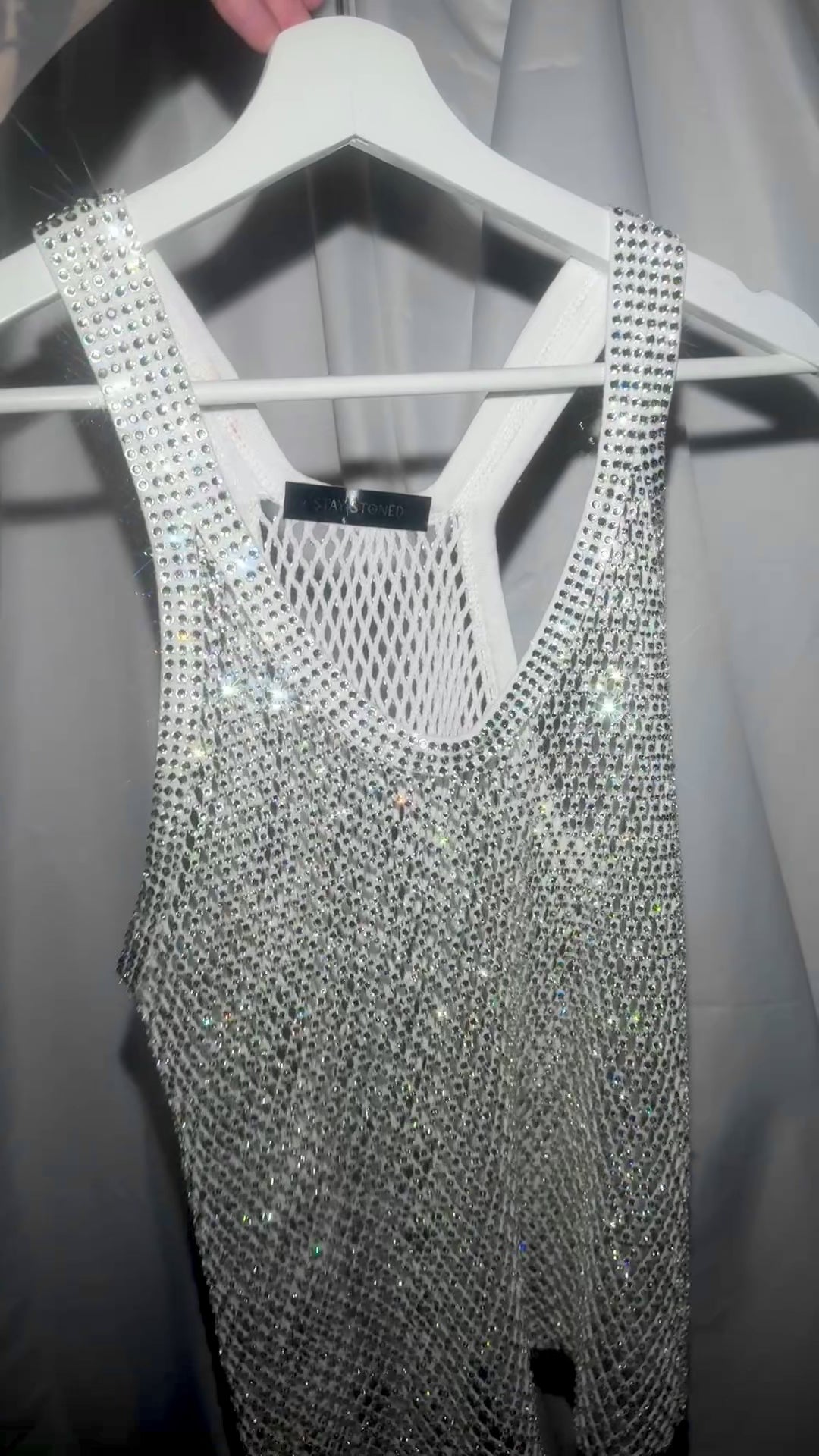 Fully crystallized, fully blinged. It’s the perfect night out shirt. Slightly cropped right at the hip bone, this shirt can fit either a medium or a large. Medium for a slightly looser fit, large for a more fitted look ✨